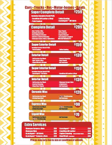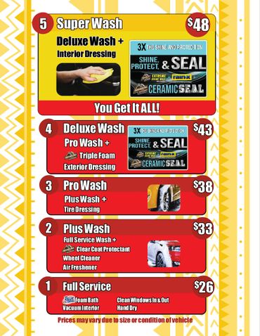 Choose from a variety of washes, including vacuuming, wheel cleaner, clear coat protectant, tire dressing, and more!